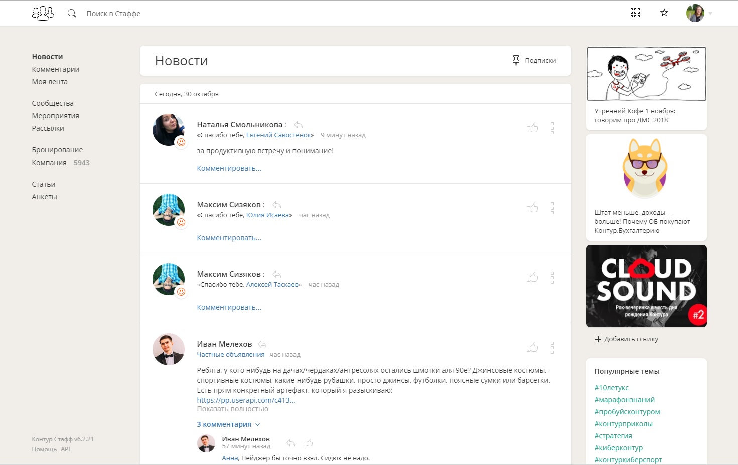 Контур.Стафф — внутренняя разработка СКБ Контур. Своя социальная сеть решает следующие проблемы внутрикорпоративных коммуникаций: