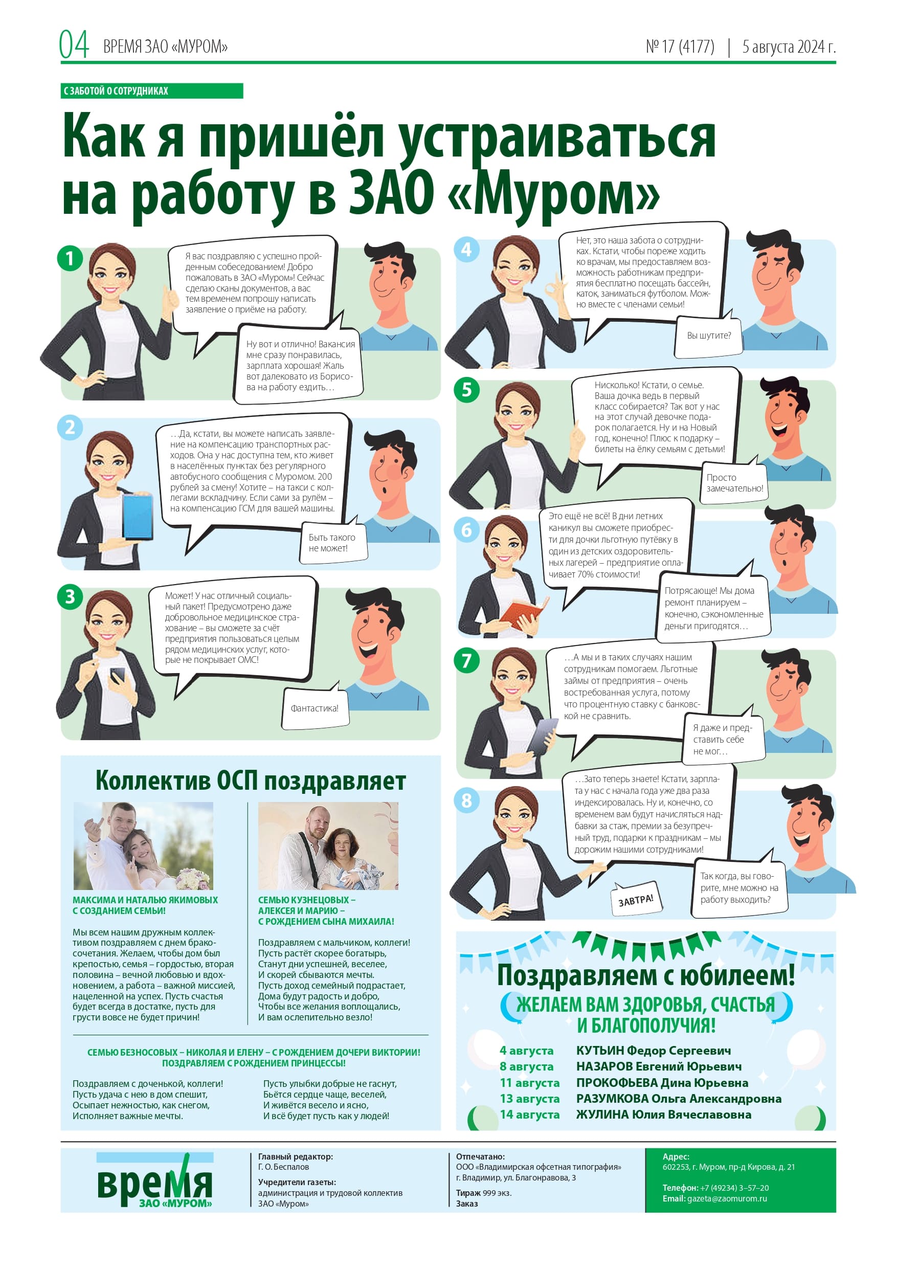 1. Дизайн новый, но цели остаются прежними. Рассказываем о всех видах деятельности предприятия, напоминаем о социальных программах и льготах, сообщаем о целях и успехах ЗАО «Муром» с максимально живой и доступной подачей материала, который подкрепляется яркими иллюстрациями.2. В обновленной газете размещаются куар-коды на социальные сети предприятия, где поддерживается круглосуточное общение онлайн. За счет этого происходит постоянное получение обратной связи от сотрудников, анализ их мнений и предложений при тесном взаимодействии с HR-службой.