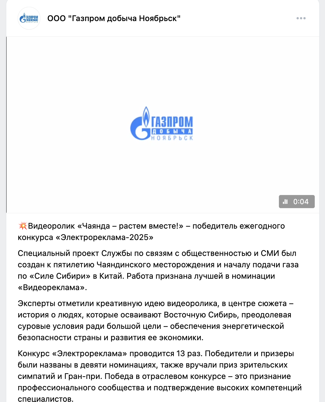 Фильм о сотрудниках компании ООО «Газпром добыча Ноябрьск» - «Чаянда – растём вместе!»