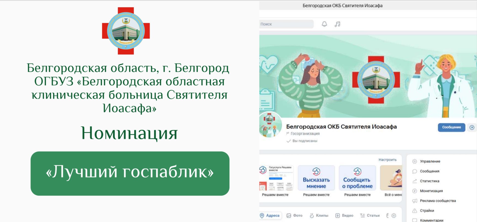 На официальной странице Вконтаке мы ежедневно публикуем актуальную информацию для пациентов на всех этапах оказания медицинской помощи. Показываем и рассказываем о самых высокотехнологичных операциях, которые проводятся только в нашей клинике. С приходом нового пресс-секретаря в начале 2024 года совместно с ГТРК-Белгород (ВЕСТИ.Белгород) были спродюсированы и сняты десятки эксклюзивных сюжетов о работе медучреждения, некоторые из которых были показаны на федеральных каналах Россия1 и Россия24. Помимо медицинской тематики присутствуют и такие, рубрики - "Я на спорте!", "Ангелы здоровья", "Домашние питомцы".
