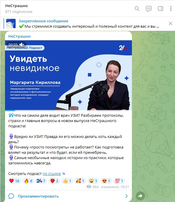 Нам удалось заинтересовать всю больницу - сегодня у нас уже целый список тем и участников, которых хватит на месяцы вперёд. На данный момент вышло 29 подкастов, ещё 4 в работе и больше 20 идей ждут своей очереди.Наши подкасты находят отклик не только у коллег внутри больницы, но и у пациентов, а также во внешнем пространстве. О нас узнают всё больше, и мы растём в охватах на разных платформах - ВКонтакте, Telegram и Rutube.