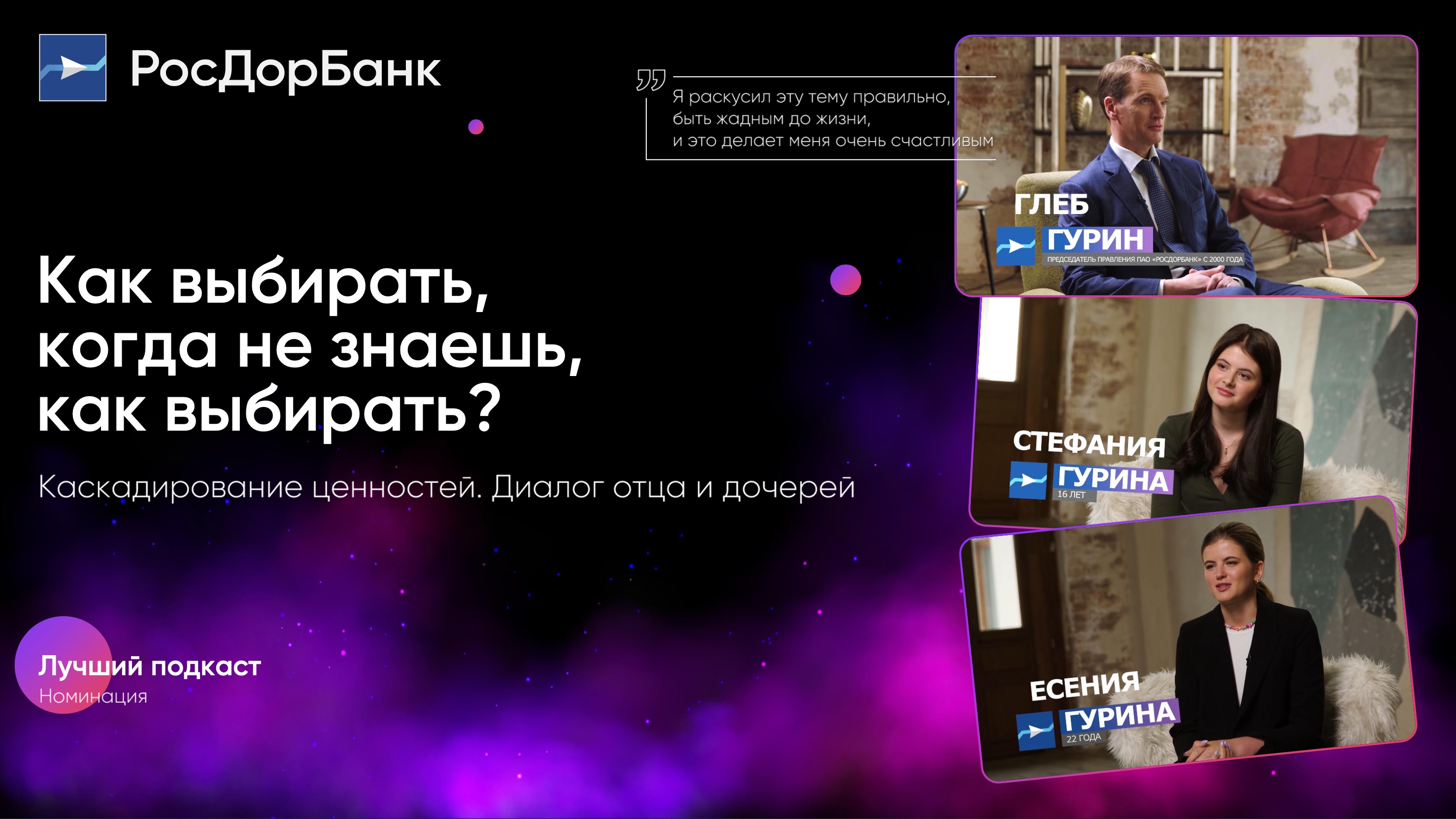 В центре внимания – разговор Председателя правления РосДорБанка Глеба Гурина с его дочерьми, где роли меняются местами: не журналисты, а близкие люди задают вопросы. Это создаёт атмосферу доверия и искренности, недостижимую в классических интервью. Темы подкаста выходят за рамки бизнеса – здесь обсуждаются выбор жизненного пути, страхи, дружба, спорт, семья и внутренние ориентиры. Благодаря такому подходу корпоративные ценности перестают быть формальными словами и превращаются в живой кодекс, передаваемый «от сердца к сердцу».