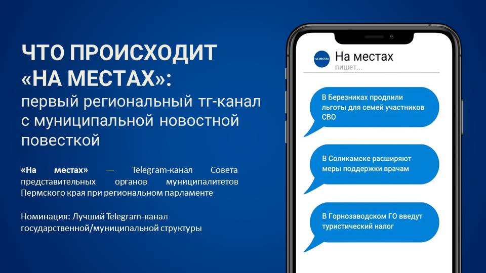 Telegram-канал «На местах» работает по принципу агрегатора новостей из первых рук. Основным источником информации служат представительные органы муниципальных образований, что позволяет напрямую рассказывать о ключевых решениях, принимаемых на местах.
