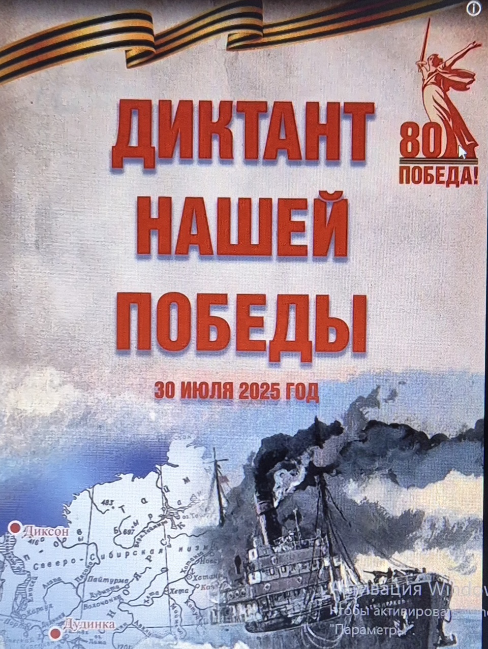 Неслучайно и темой ОРФОГРАФИЧЕСКОГО диктанта стал уникальный исторический факт, а именно первое столкновение в Карском море вражеского корабля «Адмирал Шеер» с ледокольным пароходом «Александр Сибиряков» недалеко от Диксона - полуострова в Красноярском крае на Таймыре. Последовавшая за этим история сражения у самого полуострова была продемонстрирована в зале Красноярского краевого суда и удаленно в локациях по ВКС в документальном фильме «Война в Арктике», который сняла в качестве режиссера руководитель ОПС Красноярского края Оксана Веселова.