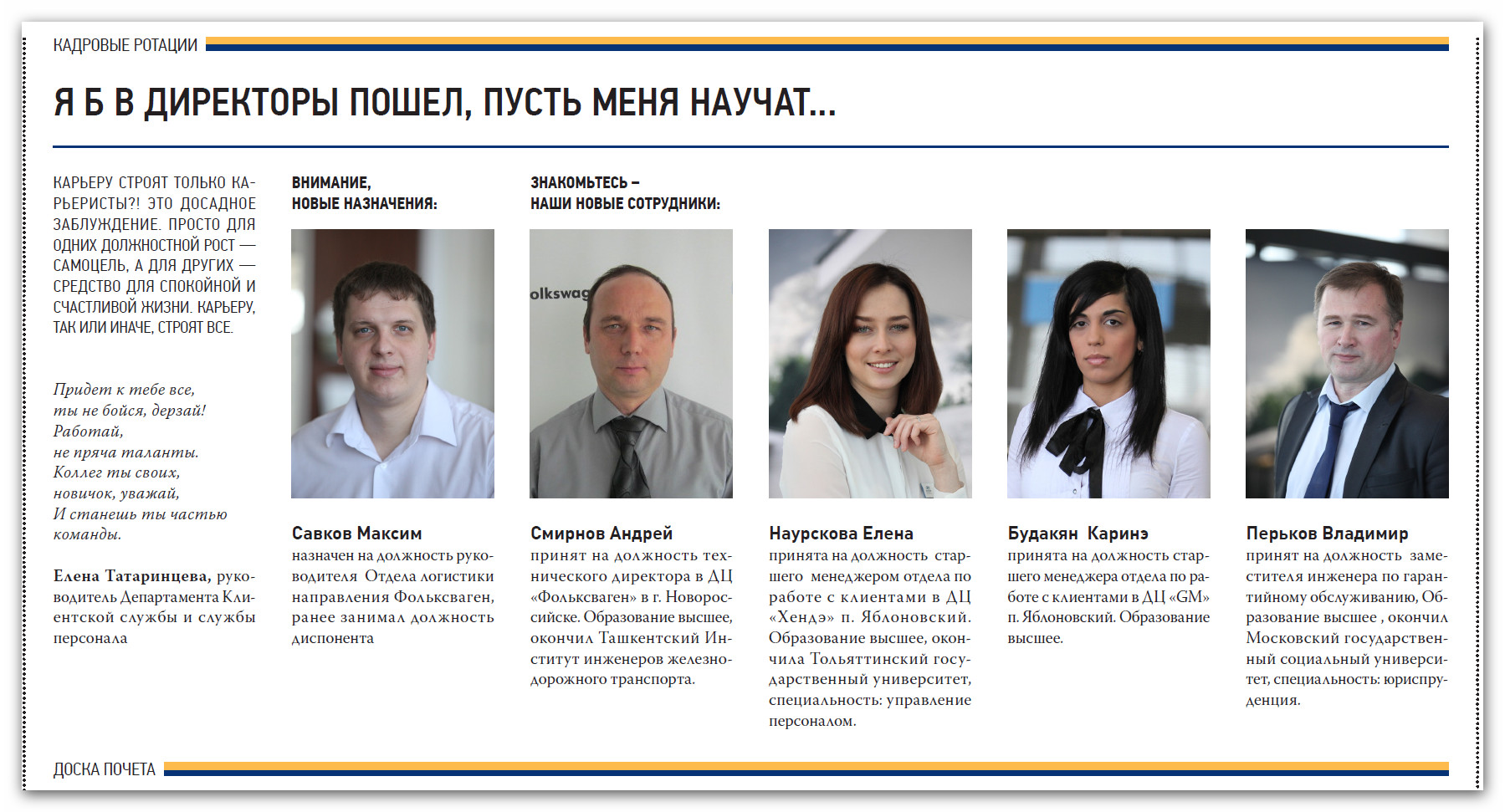 Наша основная цель: Повысить уровень корпоративного общения и культуры! Наша газета - это наш инструмент для осуществления корпоративных коммуникаций. Корпоративное издание способствует объединению персонала в команду! Самые амбициозные цели предприятия сегодня недостижимы без поддержки сотрудников — вот почему мы стремимся уделить внимание внутренней информационной стратегии.Перед нами стояла задача разработать лаконичное и информативное издание, которое интересно читать сотрудникам, а также гостям и клиентам дилерских центров. Корпоративная газета должна отражать философию Группы компаний – стремление к постоянному развитию и достижению результатов, а также формировать единую информационную среду и объединять персонал компании. Корпоративная пресса помогает нам: