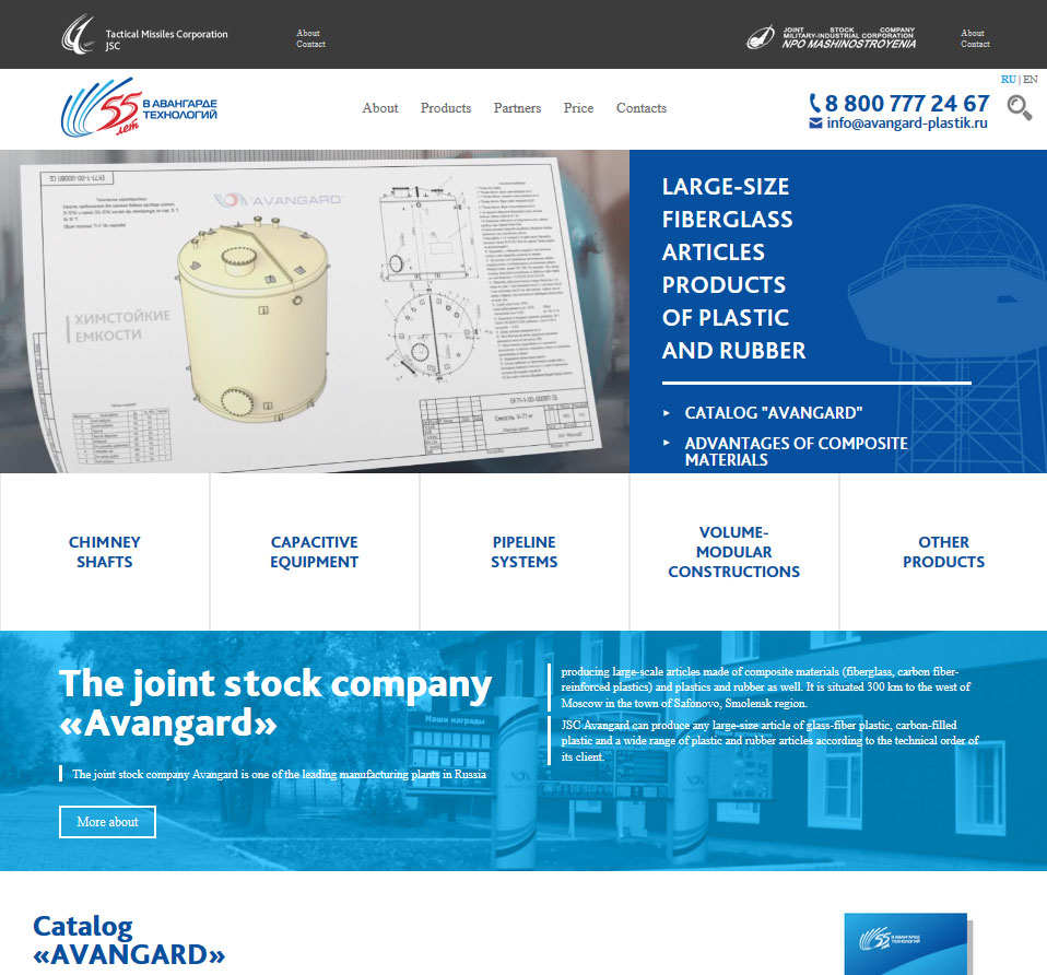 Корпоративный сайт Акционерного общества «Авангард» www.avangard-plastik.ru создан в целях формирования имиджа предприятия, информационной открытости, доступности и объективности освещения деятельности предприятия.На сайте размещена подробная информация всех направлениях деятельности АО «Авангард»: