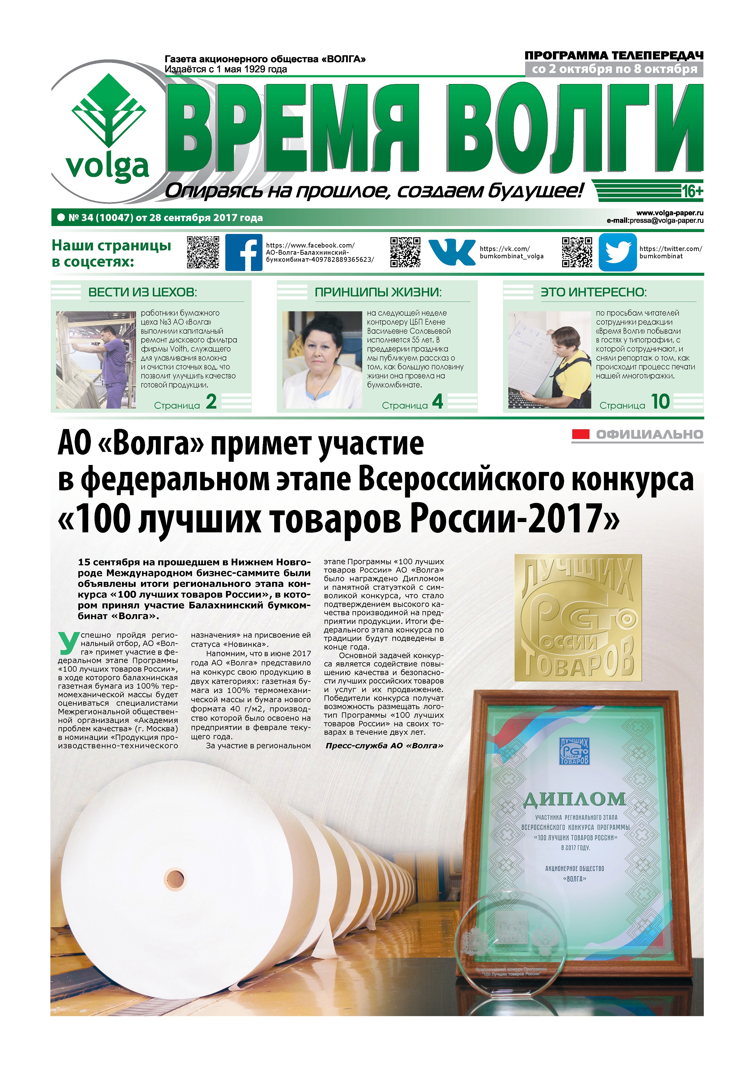 В результате газета не только получила новый дизайн и формат, но и стала более современной и полноцветной, в ней появились новые корпоративные рубрики, удобная программа телепередач, QR-коды со ссылками на дополнительные материалы, а количество полос в газете было увеличено с 8 до 12.Кроме того, электронные выпуски газеты начали выкладываться на корпоративный сайт АО «Волга», а с января 2017 года – размещаются также в официальном сообществе компании в социальной сети ВКонтакте (https://vk.com/bumkombinat_volga (в разделе «Документы»).