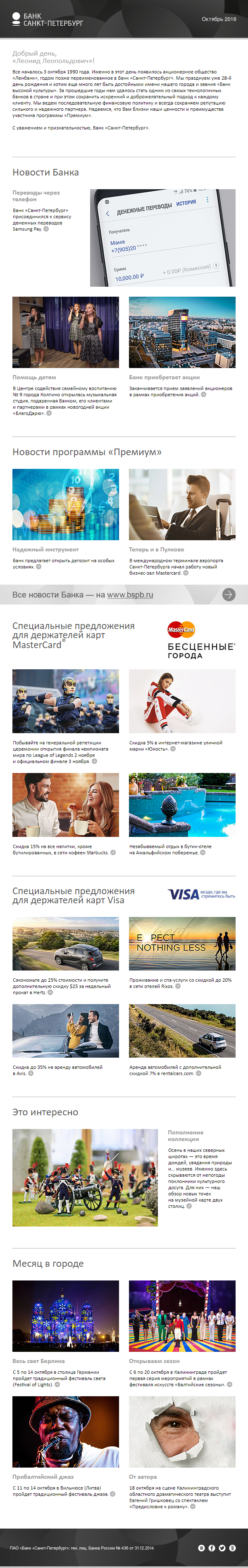 Ежемесячный дайджест распространяется примерно по 5000 адресов в Санкт-Петербурге, Калининграде и Москве - регионах присутствия банка "Санкт-Петербург". Почтовая рассылка рассказывает о главных новостях банка и программы "Премиум", предложениях международных платежных систем. Помимо этого, в каждом выпуске рассылки есть лонгрид на актуальную тему и 5-10 городских новостей. Таким образом, рассылка становится не только узкоспециализированным информационным бюллетенем, но и афишей самых значительных событий, на которые стоит обратить внимание.