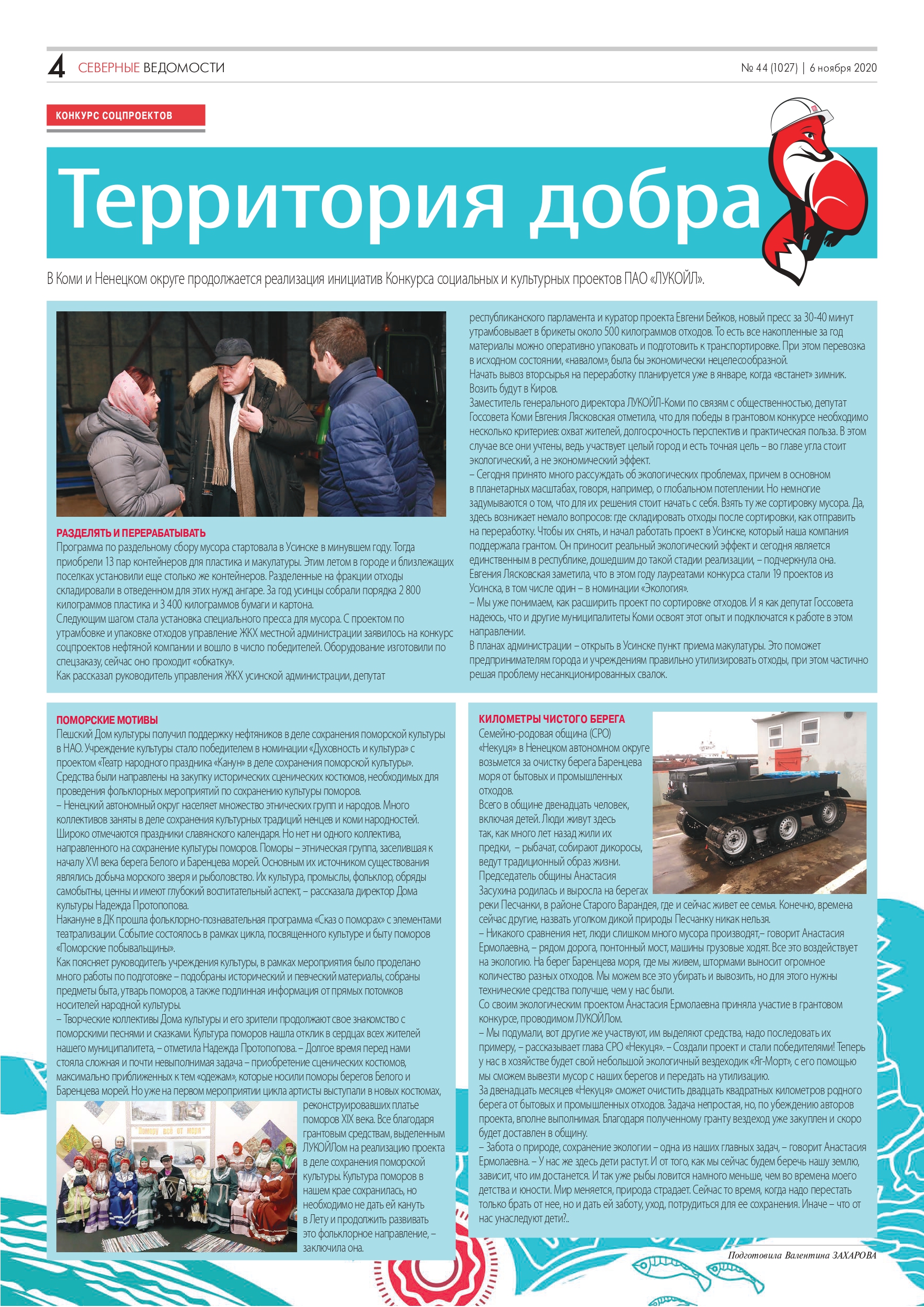 Компания ЛУКОЙЛ ежегодно проводит в Коми и Ненецком округе грантовый Конкурс социальных и культурных проектов. С каждым годом число заявок растет, в 2020 победителями стали порядка 80 авторов.