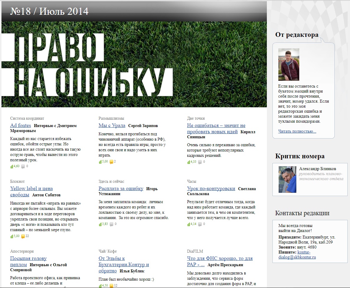 Автором Диалога может стать любой сотрудник. В каждом выпуске — до 5-7 бизнес-статей. Редактор — человек, которого в компании знают. Необязательно топ-менеджер, но тот, кто имеет вес в компании и заработал авторитет делами: эксперт из управления разработки или техподдержки, руководитель управления или отдела продаж.