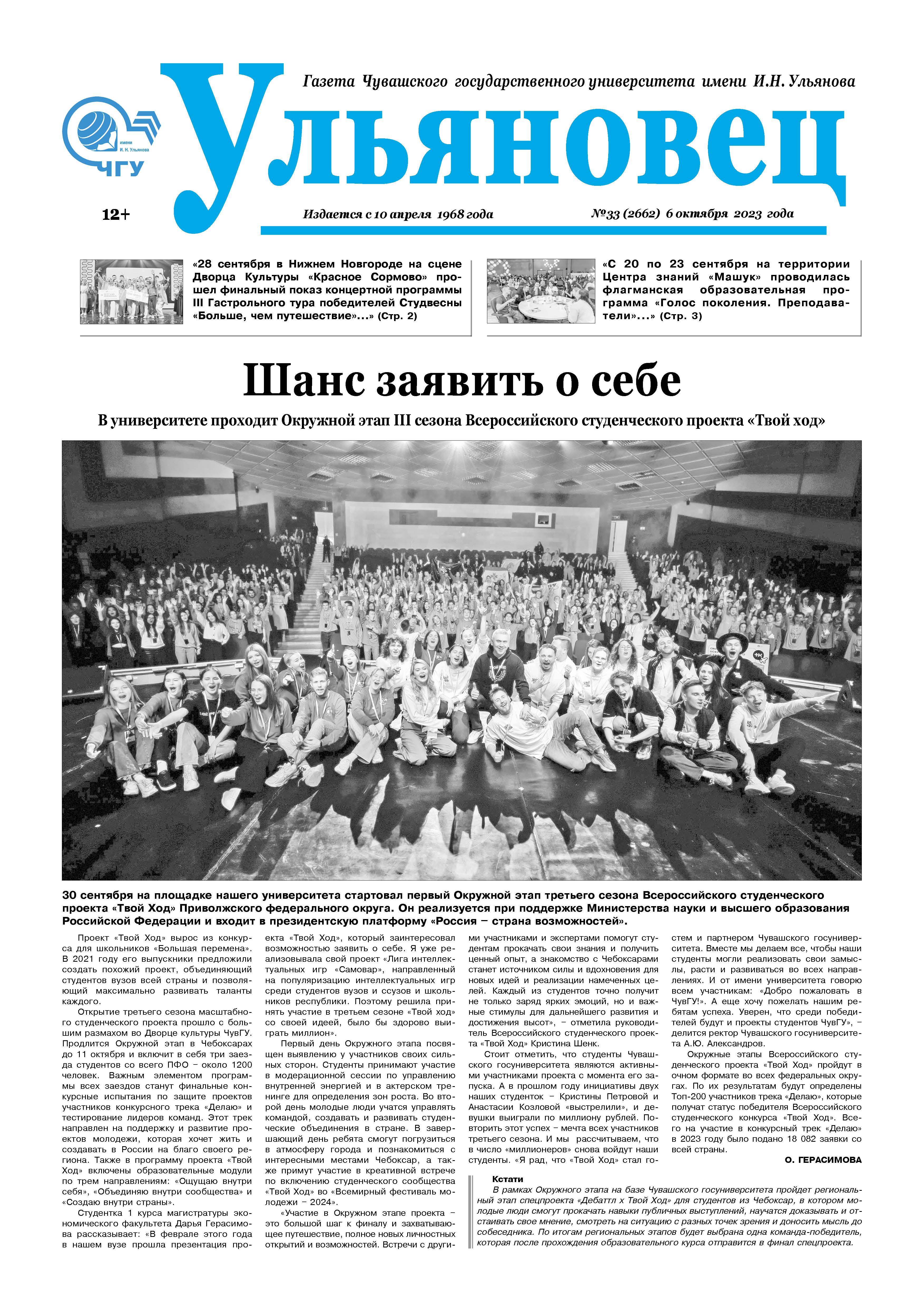 азета "Ульяновец" Чувашского государственного университета имени И.Н. Ульянова выходит в свет более полувека. в этом году она отметила круглую дату – 55 лет.1 сентября 1967 года распахнул свои двери Чувашский государственный университет, а спустя чуть больше полугода, 10 апреля 1968 года, вышел в свет первый номер вузовской газеты «Ульяновец», который можно по праву называть биографом университета.