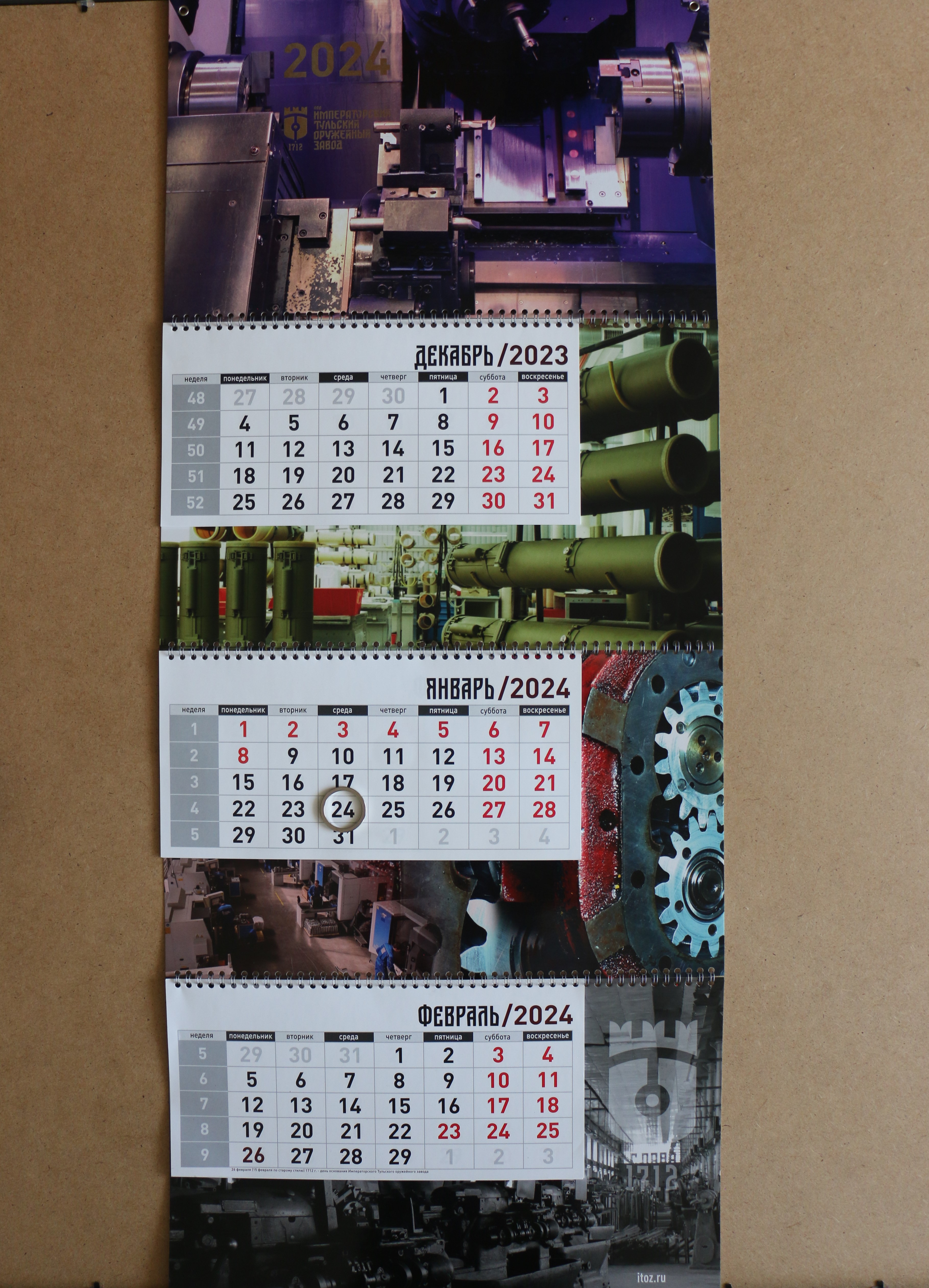 Вдохновившись, казалось бы, стандартными трудовыми буднями предприятия, Императорский Тульский оружейный завод создал комплект календарей, посвященный тематике промышленного искусства. Он состоит из перекидного и квартального образцов. Специально для них был также разработан подарочный пакет в том же дизайне. Все фотографии, используемые в календарях, были выполнены на пленочную камеру индустриальным фотографом Артемом Васильковым, что придает им еще больше атмосферности.