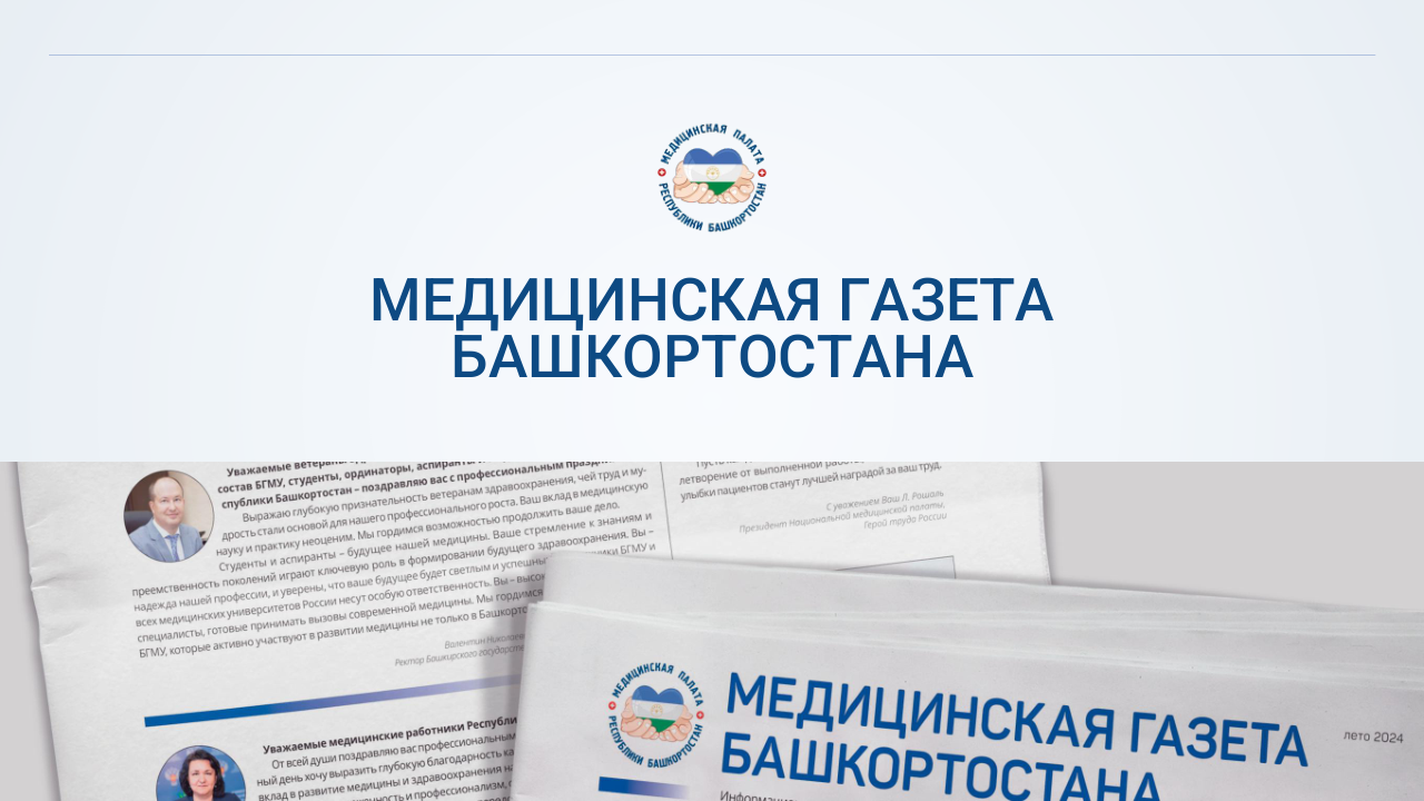 "Медицинская газета Башкортостана" – это корпоративное издание Медицинской палаты Республики Башкортостан, служащее центральной платформой для информирования медицинского сообщества региона. Проект направлен на всестороннее освещение актуальных вопросов здравоохранения, включая новые методы лечения, достижения и вызовы в отрасли, а также на обмен опытом между специалистами. Газета способствует укреплению профессионального единства, повышению квалификации и формированию конструктивного диалога между врачами, пациентами и органами власти. Наше издание является неотъемлемой частью развития и поддержки системы здравоохранения Башкортостана, отражая её динамичное развитие и многогранность.Сайт проекта