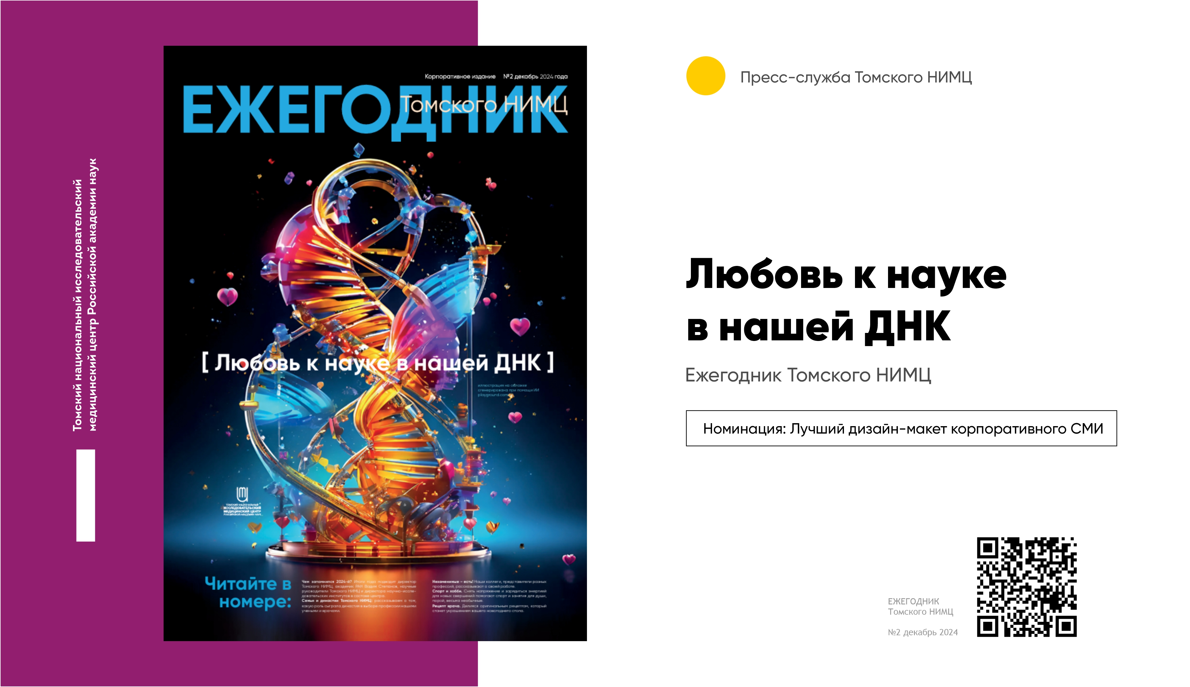 Корпоративный годовой отчет 2024 года «Любовь к науке в нашей ДНК» выпущен в виде качественной печати формата А3, включающий материалы о коллективе, исследованиях, спортивных мероприятиях и личной жизни сотрудников. Ключевое отличие — оригинальная обложка, созданная искусственным интеллектом, воплощающая концепцию взаимодействия науки и эмоциональной привязанности.