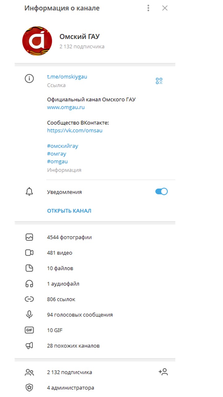 Численность аудитории составляет более 2 000 человек и имеет тенденцию ежегодного роста. Просмотры составляют около 1 млн. Коэффициент вовлеченности стабильно превышает 2%. За время существования канала на нем размещено 4544 фото, 481 видео, 806 ссылок. Благодаря развлекательным форматам аудитория участвует в обсуждениях, конкурсах, опросах. Телеграм-канал - это не дубль других информационных ресурсов (сайта, ВК). Используется разный визуал, стиль подачи информации. За последний год появилась отдельная целевая группа так называемых "телеграмщиков" из числа коллег, студентов, которые просят транслировать крупные события, мероприятия не только в ВК, но и на Телеграм-канале, так как он им "нравится больше, кажется более удобным". При этом конкуренции между админами нет! Наоборот. Это хорошая мотивация повышения качества работы на ресурсе для админов и Телеграм-канала, и ВК. Отмечается интерес к контенту вуза на Телеграм-канале со стороны СМИ регионального и всероссийского уровней. Поступает много запросов на интервью, комментарии со ссылкой на конкретные публикации на канале вуза. Репосты новостей отмечаются на таких популярных в России каналах как @SolovievLive; новости становятся поводами для публикации на @mcx_ru, @rosng01, @tass_science и др.Телеграм-канал Омского ГАУ является эффективным инструментом коммуникации и продвижения университета. Высокие показатели аудитории, просмотров и вовлеченности свидетельствуют о его популярности и актуальности для подписчиков. Дальнейшее развитие канала требует постоянного анализа, оптимизации контента и активного взаимодействия с аудиторией