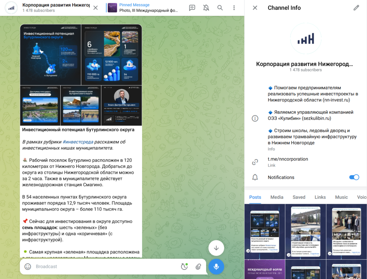 Telegram-канал Корпорации развития Нижегородской области ведется с марта 2022 года в связке с группой во ВКонтакте, каналом в Дзен, новостным разделом на инвестиционном портале Нижегородской области.