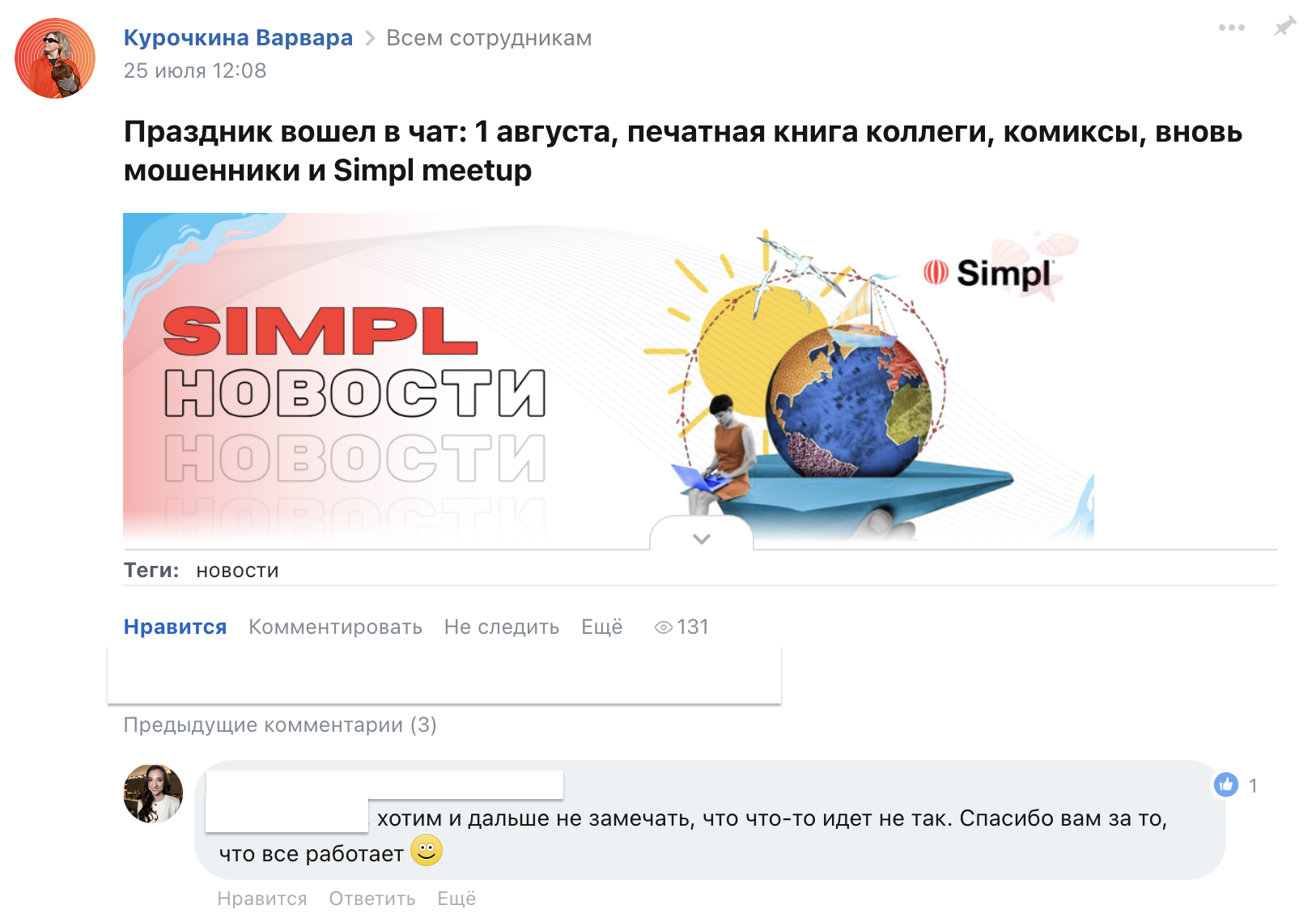 Simpl новости — еженедельный пятничный дайджест для сотрудников о жизни компании и коллегах. Мы создали собственную «полосу» на корпоративном портале, чтобы пятница ассоциировалась не только с окончанием рабочей недели, но и с позитивом: время подвести итоги, порадоваться достижениям и зарядиться хорошим настроением перед выходными.