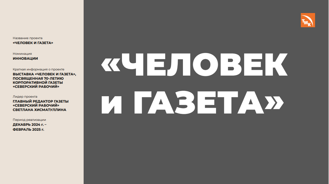 Выставка "Человек и газета", посвященная 70-летию газеты "Северский рабочий" (корпоративное издание Северского трубного завода, входящего в Трубную Металлургическую компанию, прошла в музейном комплексе "Северская домна". Иммерсивная экспозиция включала в себя несколько тематических локаций: «Эволюция первой полосы», «Анализ тем», «Завод и город в объективе фотографа», «Кабинет редактора», «Летний дворик». На выставке были представлены ранние фотоаппараты, уникальные рукописи, документы, касающиеся создания газеты, редакционные материалы и другие исторические экспонаты.Цель проекта