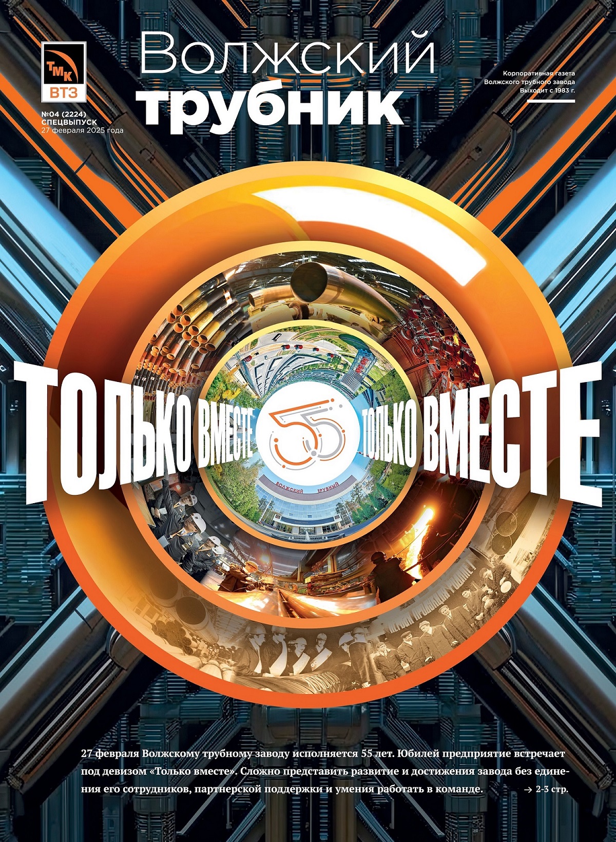 Спецвыпуск корпоративной газеты "Волжский трубник" вышел к 55-летию Волжского трубного завода, 27 февраля текущего года. В издании на содержательном и иллюстративном уровнях раскрывается идея о том, что успех возможен только вместе. Летопись предприятия представлена сквозь призму совместного труда сотрудников. Обращает на себя внимание обложка. Она выполнена в стилистике агитационного плаката и при этом сохраняет функцию иллюстрации газетного материала. Воплотить художественную идею редакции помог художник-дизайнер, член Международной Ассоциации "Союз дизайнеров" Олег Черноскутов (г. Волжский, Волгоградская область). Тираж спецвыпуска распространялся на территории предприятия и в городских творческих пространствах, где проходили юбилейные торжества.