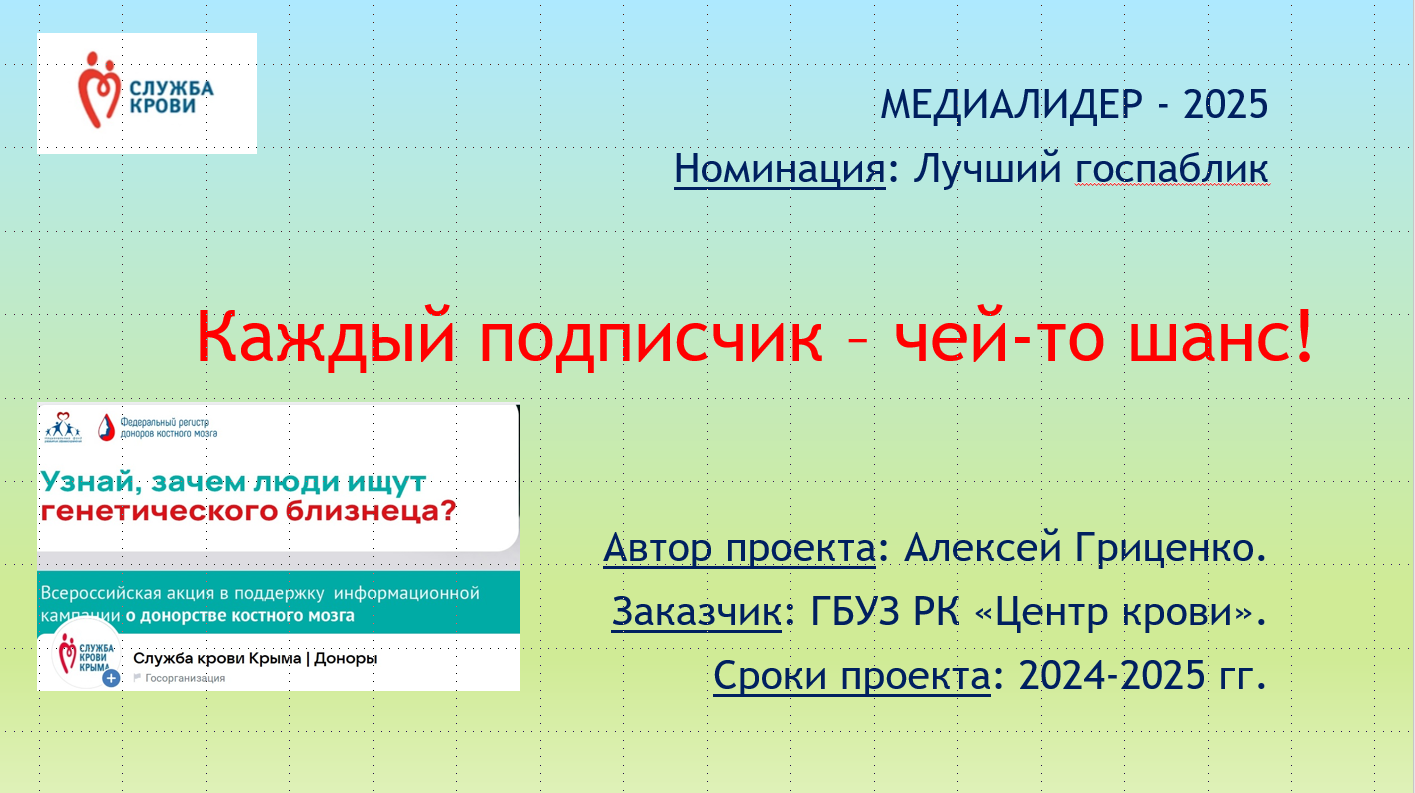 Автор: Гриценко Алексей Павлович, менеджер по связям с общественностью ГБУЗ РК "Центр крови"