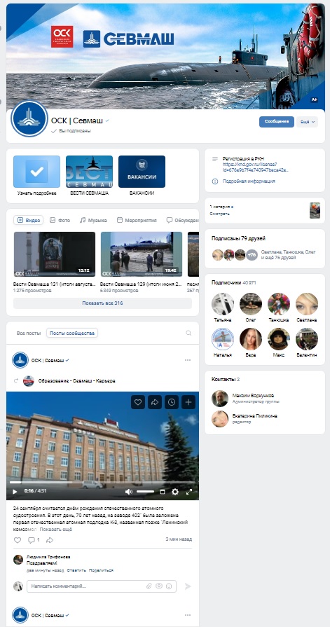 1. Группа Севмаша в социальной сети ВКонтакте – это площадка, которая ярко рассказывает о жизни кораблестроительного предприятия, его сотрудников. Наибольший эффект от информации достигается путем регулярной публикации контента, разнообразия публикуемых постов (от текстов до инфографики, от коротких видеоклипов до фильмов производства телестудии предприятия, от единичных фотографий до тщательно отобранных фоторепортажей). На стене можно найти обращения генерального директора – как правило, они набирают больше просмотров, чем другие посты, и получают положительный отклик, что дает возможность положительно оценивать отношение трудового коллектива к его руководству. Тепло и с душой встречают поздравления с профессиональными и государственными праздниками, рассказы об отдельных членах коллектива. На странице Севмаша ВКонтакте публикуются материалы из газеты «Корабел» - корпоративного издания завода. Таким образом большее количество читателей имеют возможность получить доступ к материалам, публикуемым в газете. Страница Севмаша в соцсети активно посещается ветеранами, которые и после ухода на заслуженный отдых не теряют связь с верфью и активно интересуются сегодняшней жизнью завода.