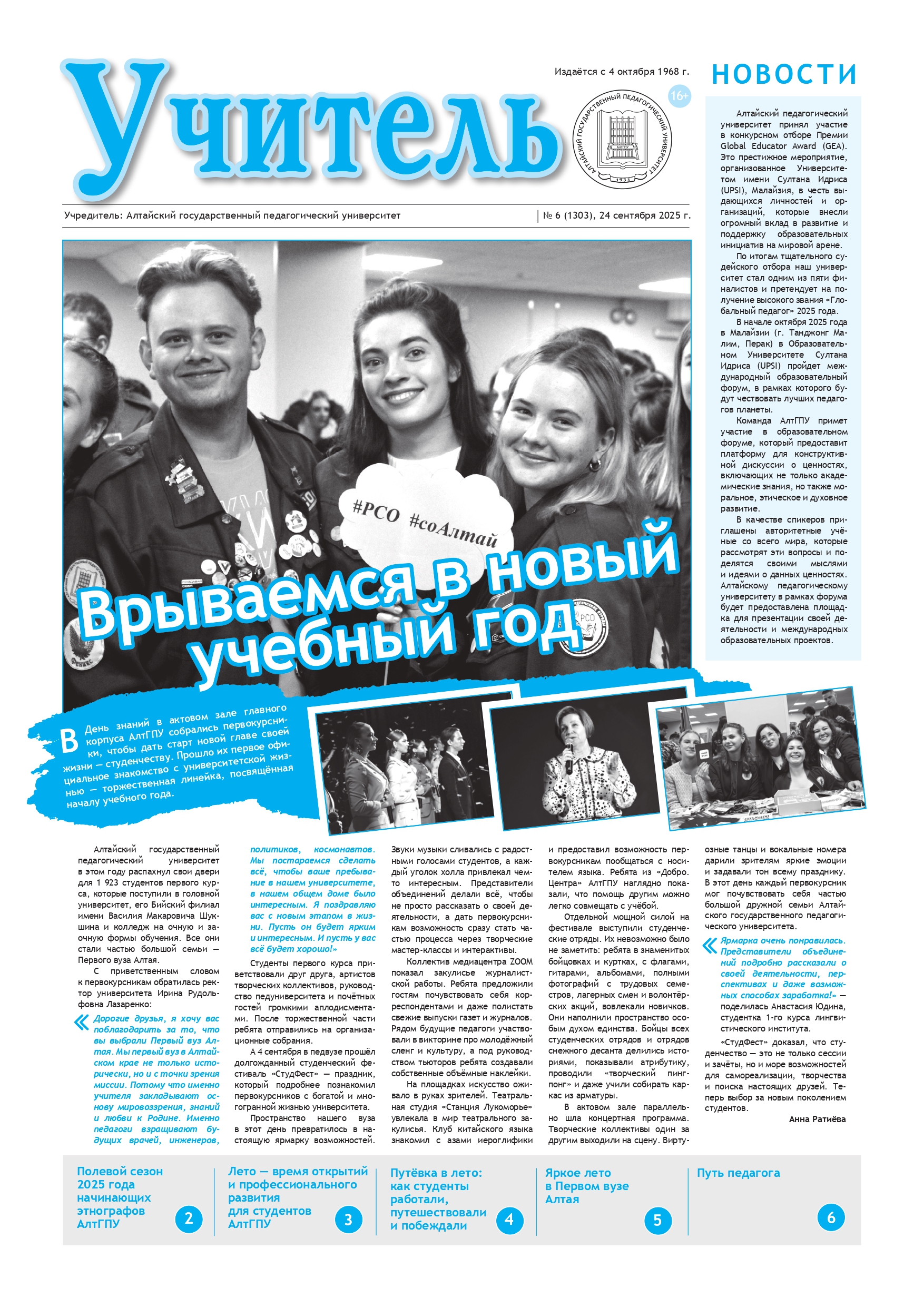 Газета «Учитель» – корпоративное издание Алтайского государственного педагогического университета, которое транслирует основные ценности АлтГПУ, миссию вуза и его корпоративную культуру.