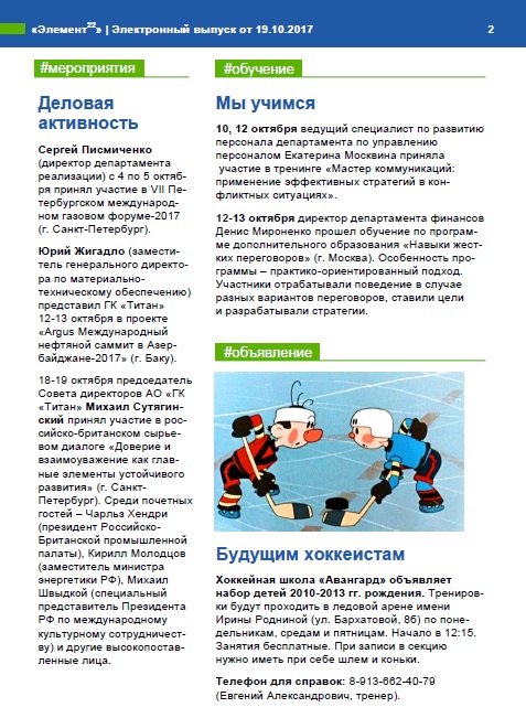 Создание издания для размещения развлекательного контента, афиши мероприятий и т.д.; аккумулирование в издании всех рассылок, исходящих от подразделений Управляющей компании. Например, презентация новых сотрудников, рассылка акции «Мясной лавки» ООО «Титан-Агро».Результат проекта