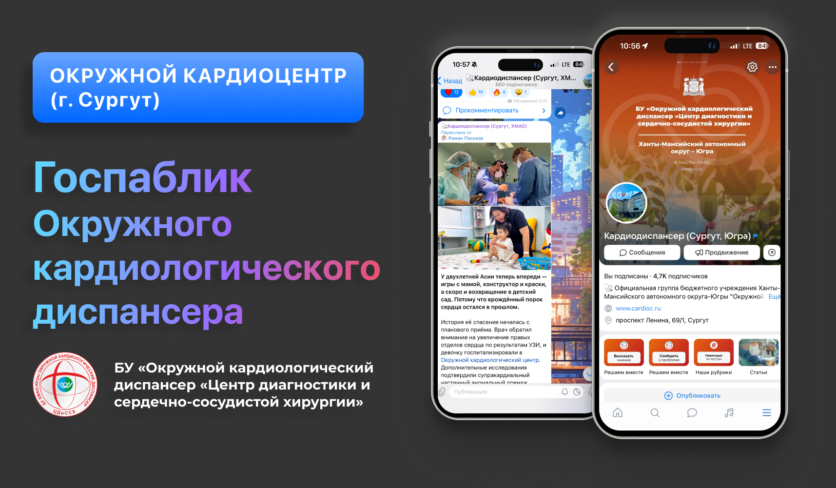 Паблик окружного кардиоцентра в Сургуте создан как информационный и коммуникационный проект с целью предоставления жителям региона актуальной информации о работе кардиоцентра, услугах, профилактике и лечении сердечно-сосудистых заболеваний. В сообществе публикуются новости, полезные советы, анонсы мероприятий и истории пациентов, что способствует активной вовлеченности и поддержке здоровья региона.Сайт проекта