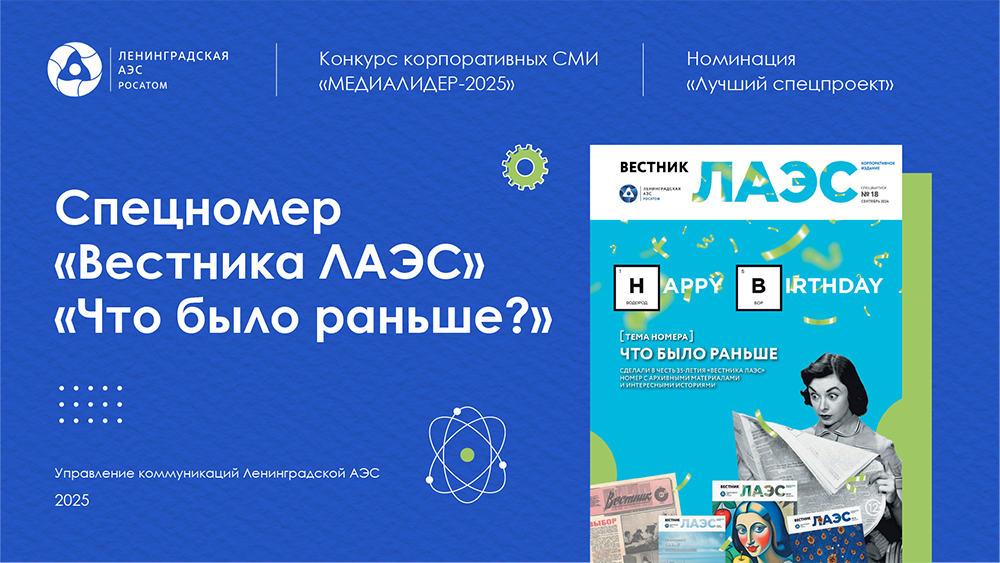 В 2024 году корпоративному изданию Ленинградской АЭС «Вестник ЛАЭС» исполнилось 35 лет. Как креативно отработать этот, на первый взгляд, банальный инфоповод? К сожалению, весь архив «Вестника ЛАЭС» не сохранился, но мы бережно храним оставшиеся номера и постепенно их оцифровываем. Поэтому мы решили собрать в единый спецномер архивные материалы, которые были напечатаны 35, 20, 10, 5 лет назад. Так читатель вместе с редакцией вспоминает нашу историю: рассматривает черно-белые фотографии, читает архивные тексты, находит знакомых и друзей на полосах издания, узнаёт что-то новое.