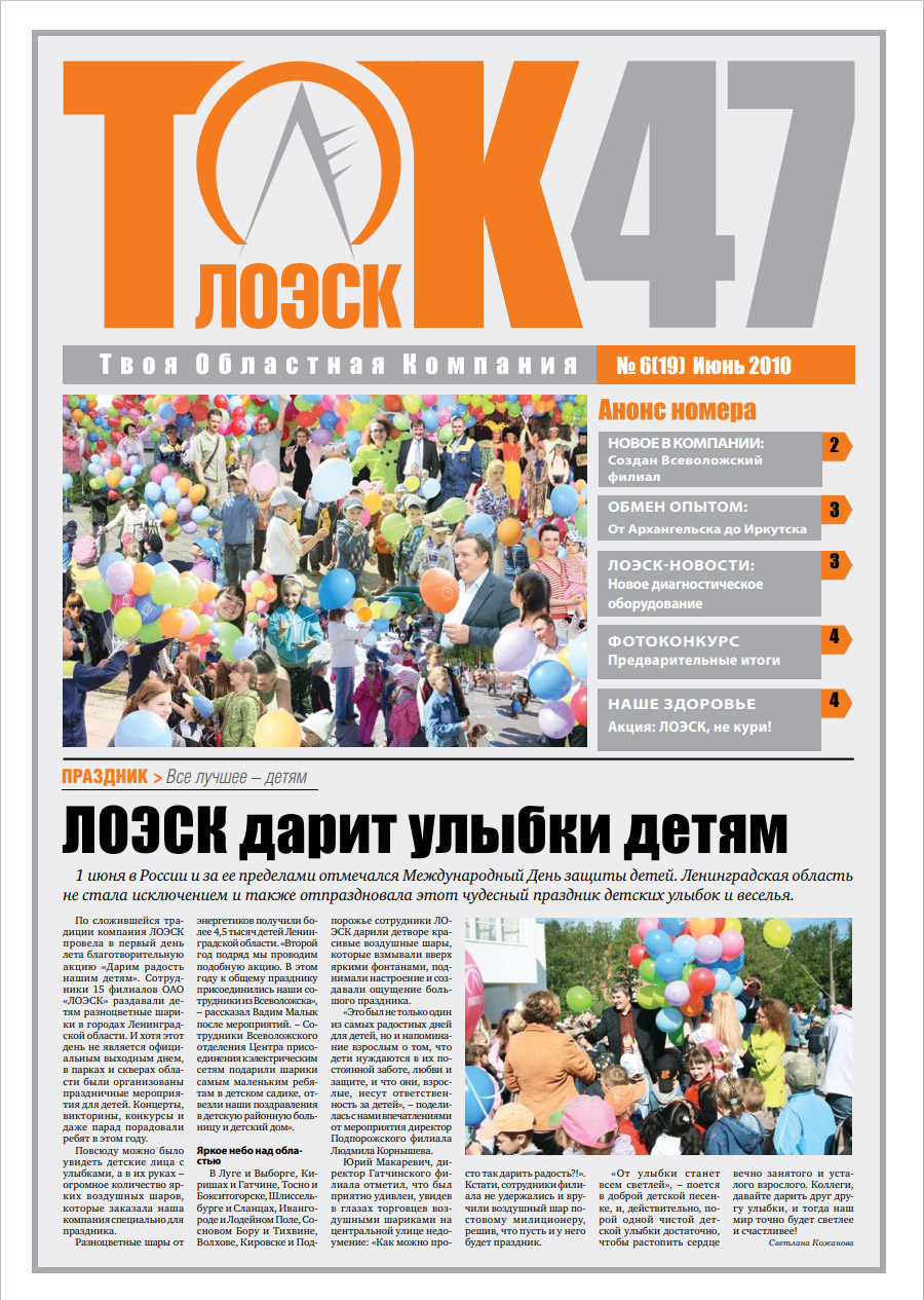 Корпоративная газета «ТОК47» рассказывает о всех значимых событиях, происходящих в компании: о достижениях ЛОЭСК в своей отрасли. Основная аудитория «ТОК47» - сотрудники всех филиалов ЛОЭСК, работающие в городах Ленинградской области и Петербурге. «ТОК47» старается избегать «протокольных» текстов, мы ищем нестандартные подходы и интересную подачу. |